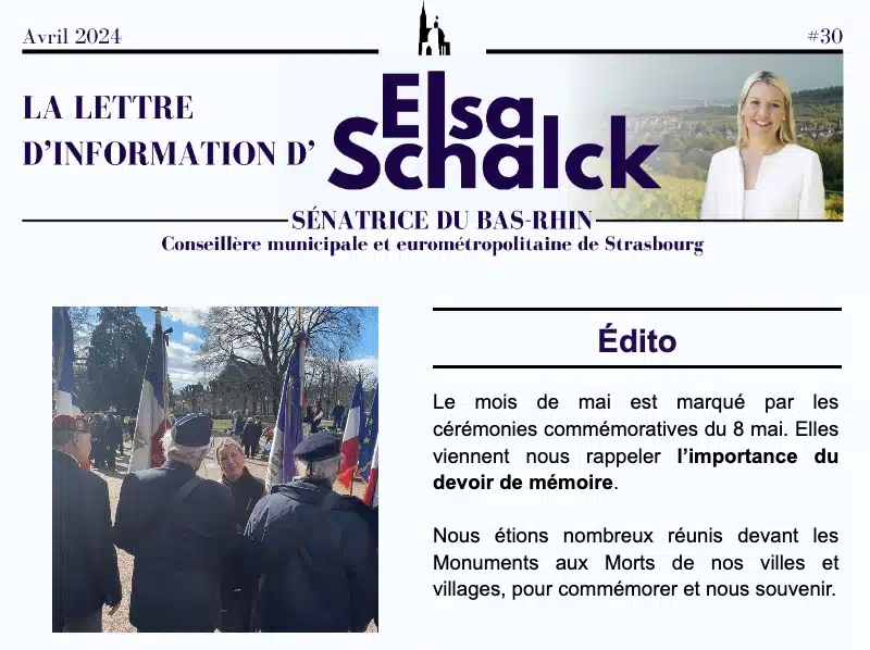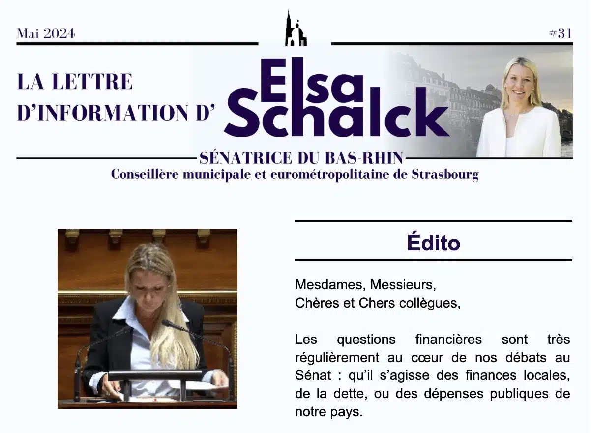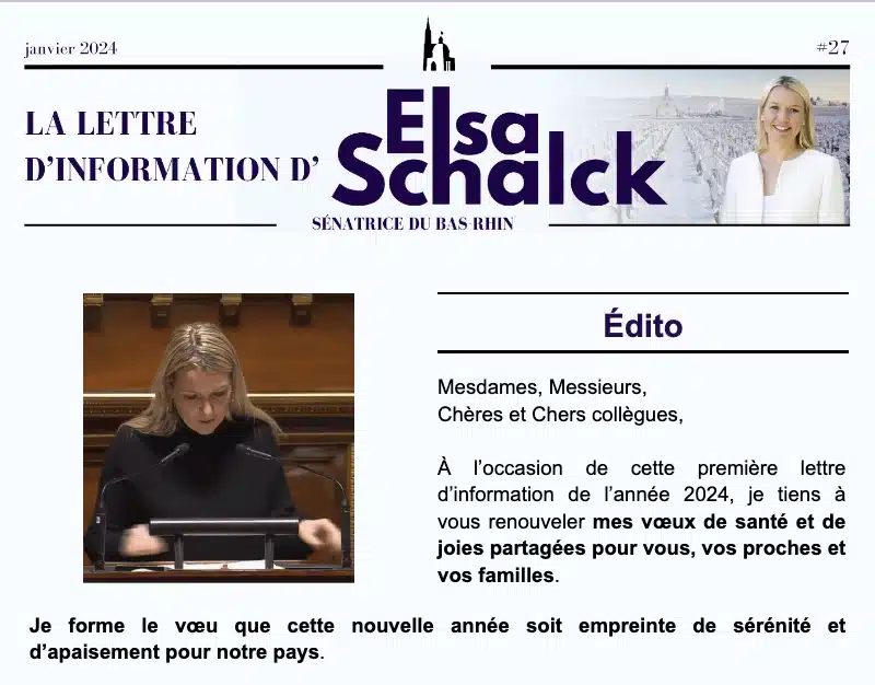 Abonnez-vous à la lettre d’information d’Elsa Schalck et recevez chaque mois son actualité dans votre boîte mail : son travail parlementaire au Sénat, ses prises de position, ses activités dans les communes d’Alsace.